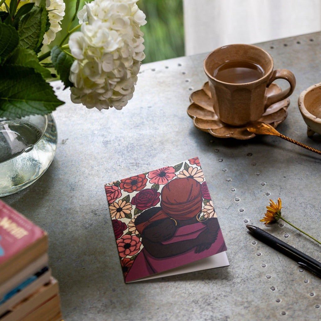 This greeting card features a Black mother embracing her child in matching headwraps with pink and red flowers surrounding them. Celebrate self-care, sisterhood, motherhood, and the joys of the season with this uplifting greeting card! It's the perfect reminder to savor the simple, special moments that make life truly special. Let's make it a Black Girl Summer year round!