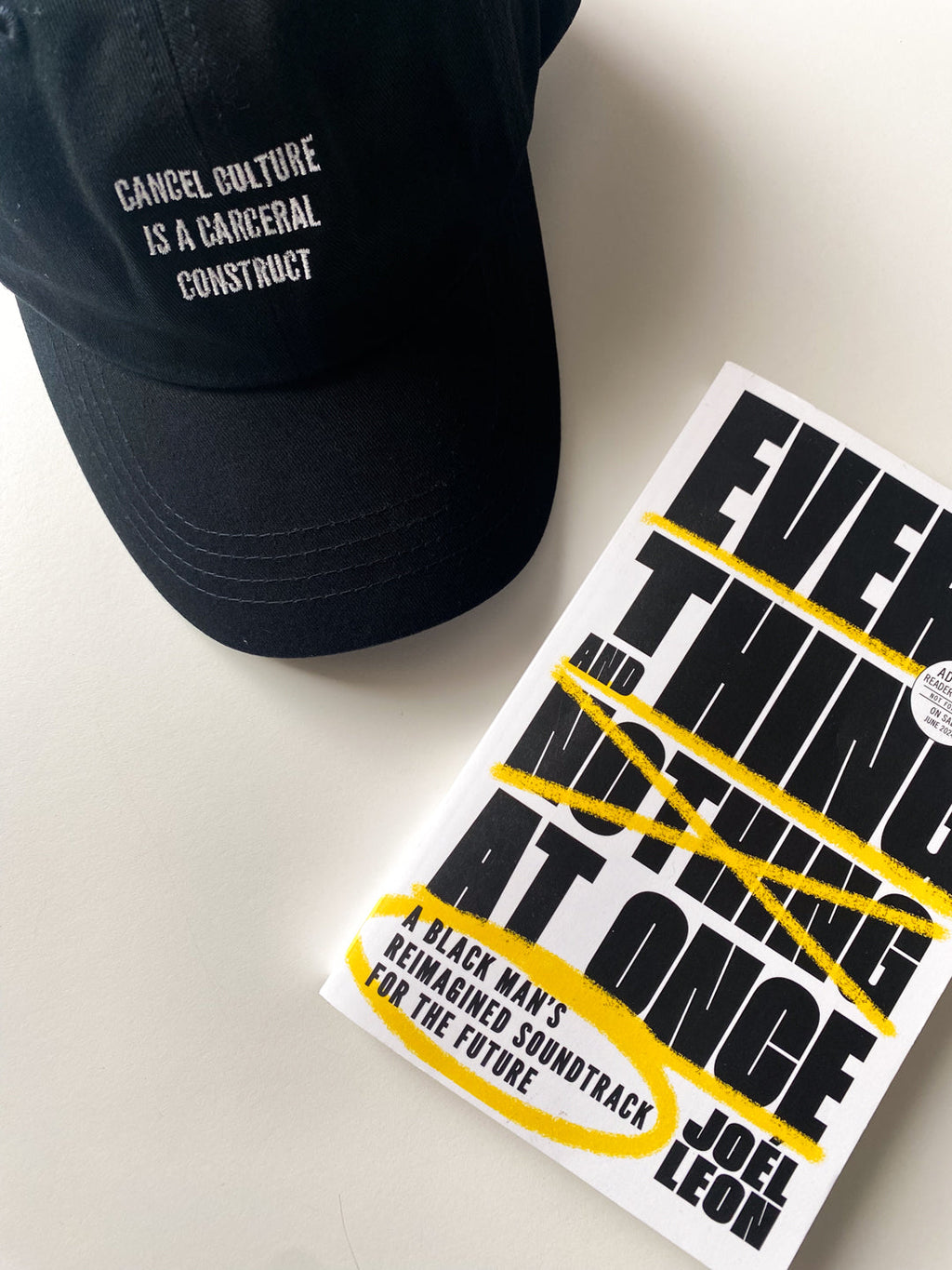 "Everything and Nothing At Once" is a thought-provoking collection of essays by Joél Leon that explores and deconstructs what it means to be a Black man in America. This hat is part of a special capsule collection created to accompany the book's release.