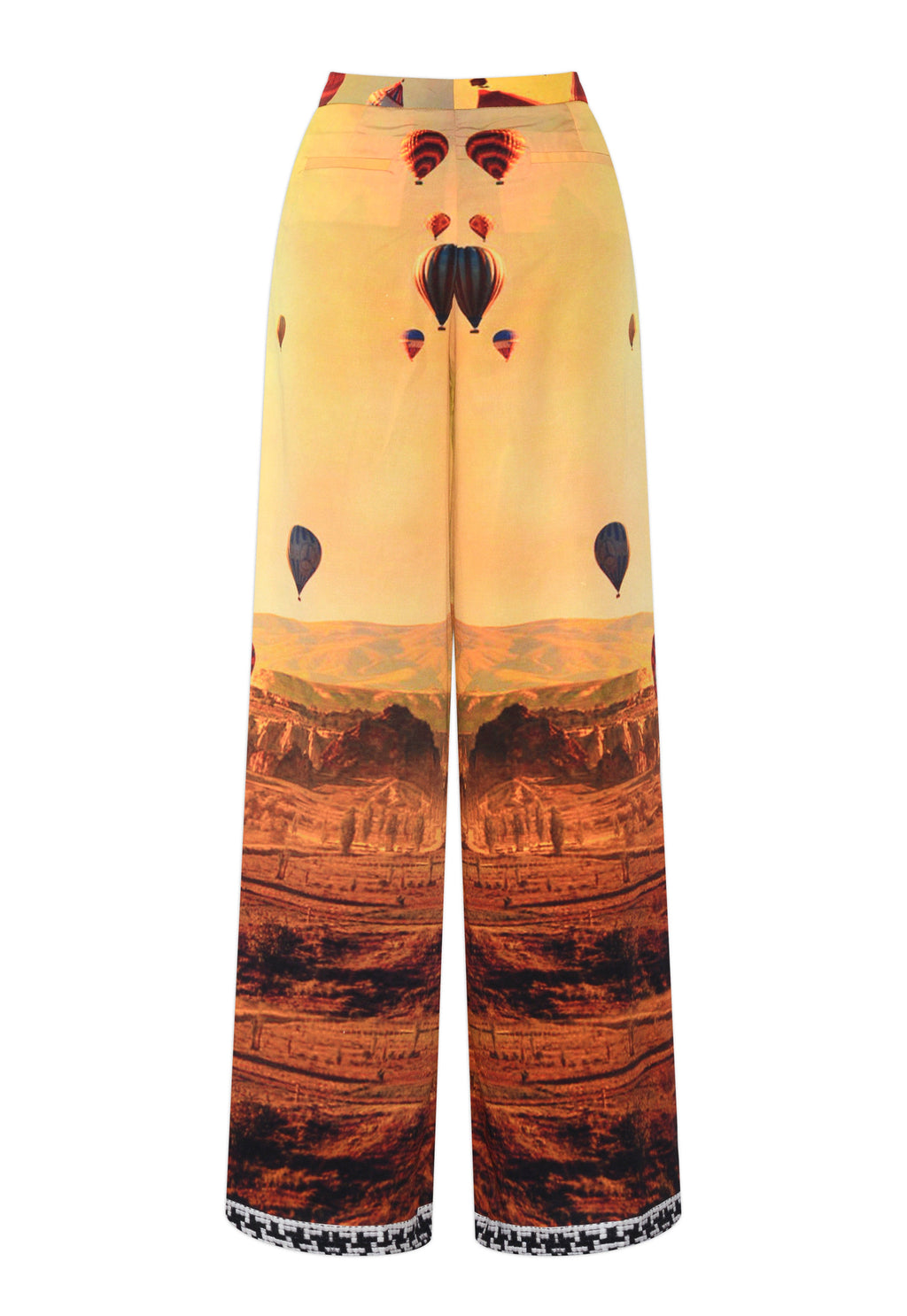 Imagine yourself floating through the clouds as you span the Cappadocia landscape in a hot air balloon, gliding above the famous "fairy chimneys." That is precisely what the warm-toned reds, yellows, browns, and oranges of the Alma print convey. The Cielo pants have a houndstooth hem, and the waistline is held in place by a zipper and clasp. Complement with any of the Alma Print matching merchandise.