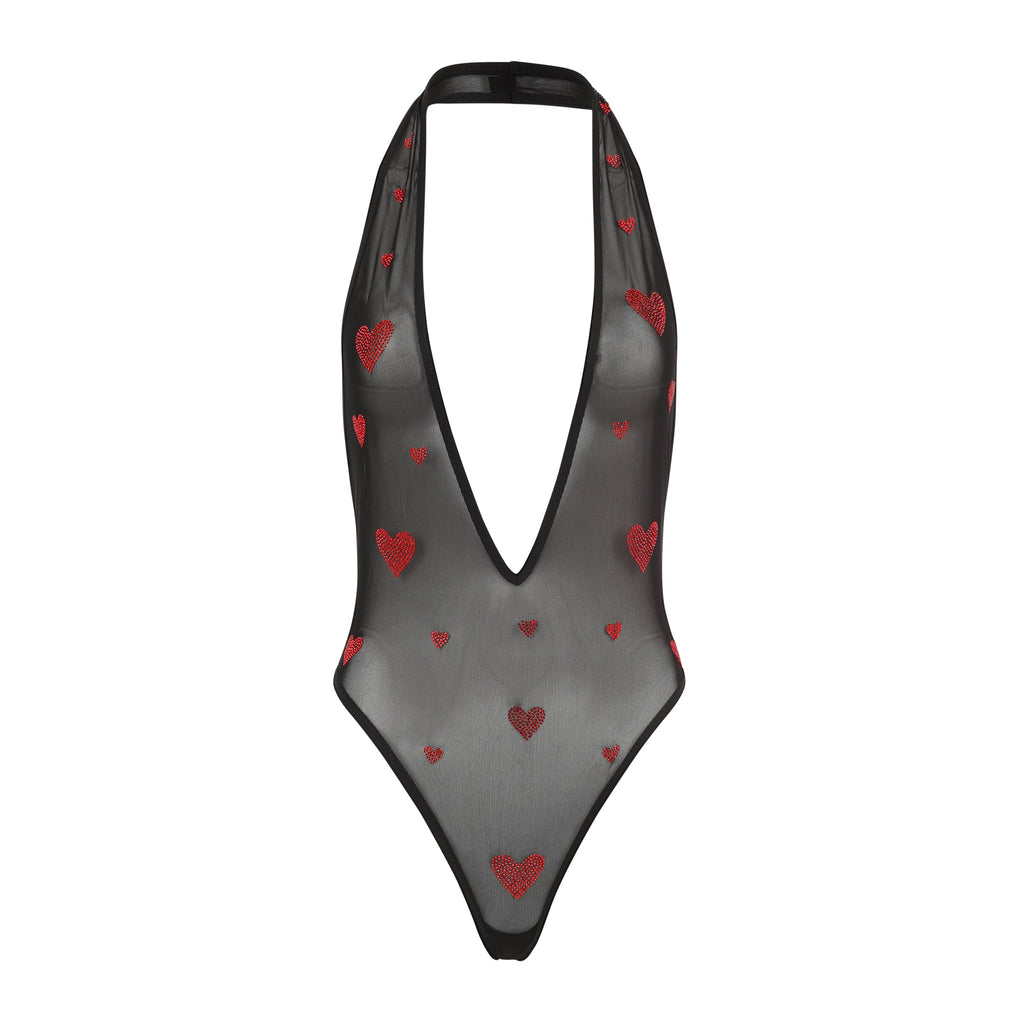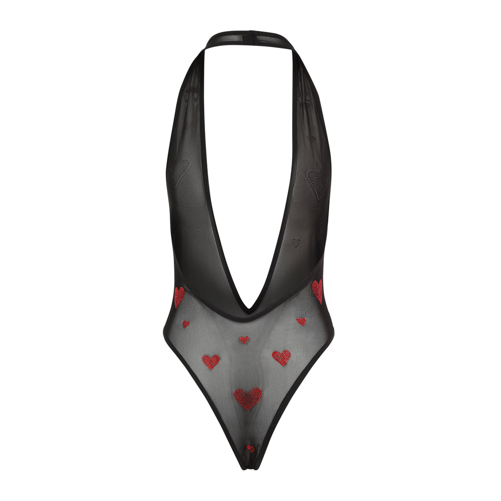Black, micro-mesh deep v halter bodysuit with cheeky thong bottom and crystal heart embellishments.