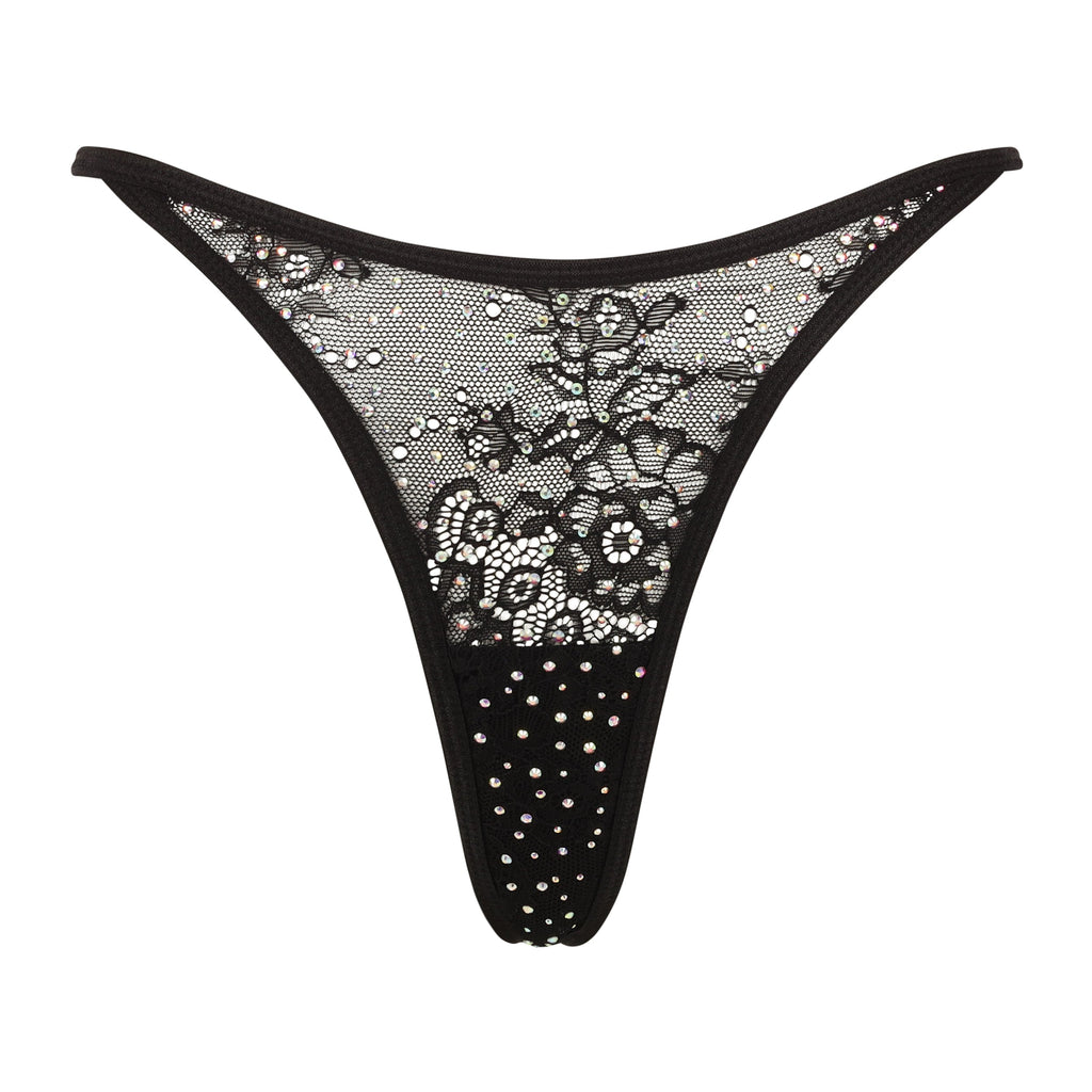 Black crystallized lace thong with string sides embellished with Crystal AB crystals.