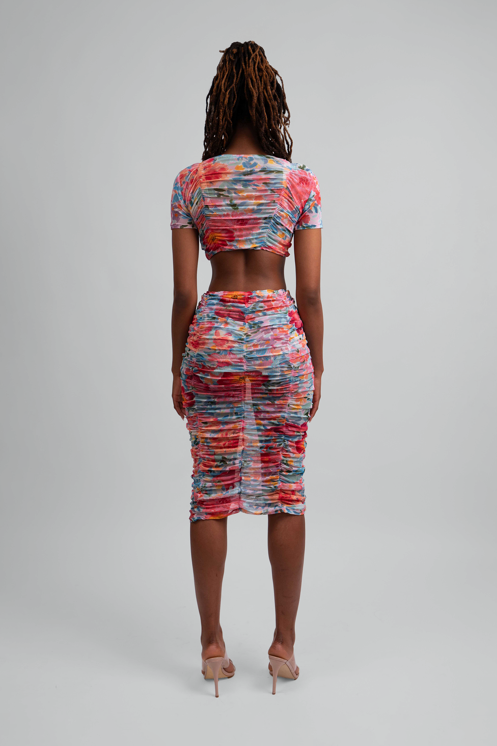 The Holly Set features a sheer mesh crop top with ruching and a round neckline, creating a stylish, fitted look. Paired with a high-rise midi skirt, this design provides a sleek silhouette and a snug, comfortable fit.
