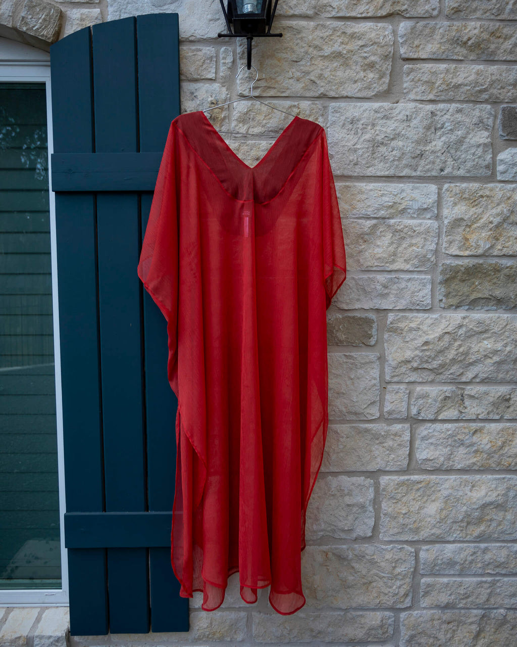 This brick-red kaftan is the epitome of effortless elegance. Let the light fabric flow in the breeze as you stroll the beach. The side slits are comfortable as you walk or lounge, and the bra savers will hold the kaftan in place for all day wear.