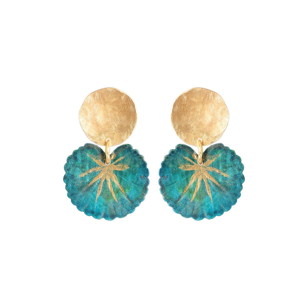Golden circles add modern punctuation to organic foliage featuring natural verdigris patina, washes of hand-painted pigment, and metallic gold detail. Brass with sterling posts. Nickel and lead free.