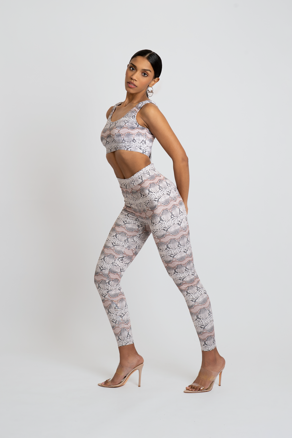 The Minerva Workout Set features a stylish snakeskin print in a neutral tone, offering a chic and functional ensemble for your active lifestyle. The top showcases a square neck with a scoop back design, cropped and cinched under the bust for a secure fit. The matching high-rise leggings gently hug your curves with a stretchy thin elastic waistband, providing both style and comfort.