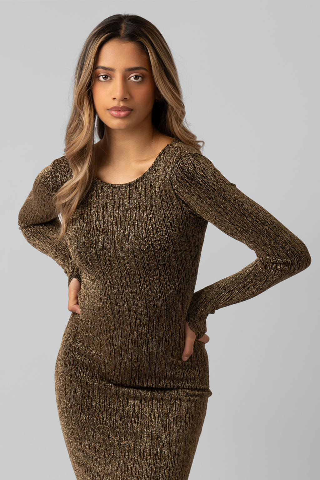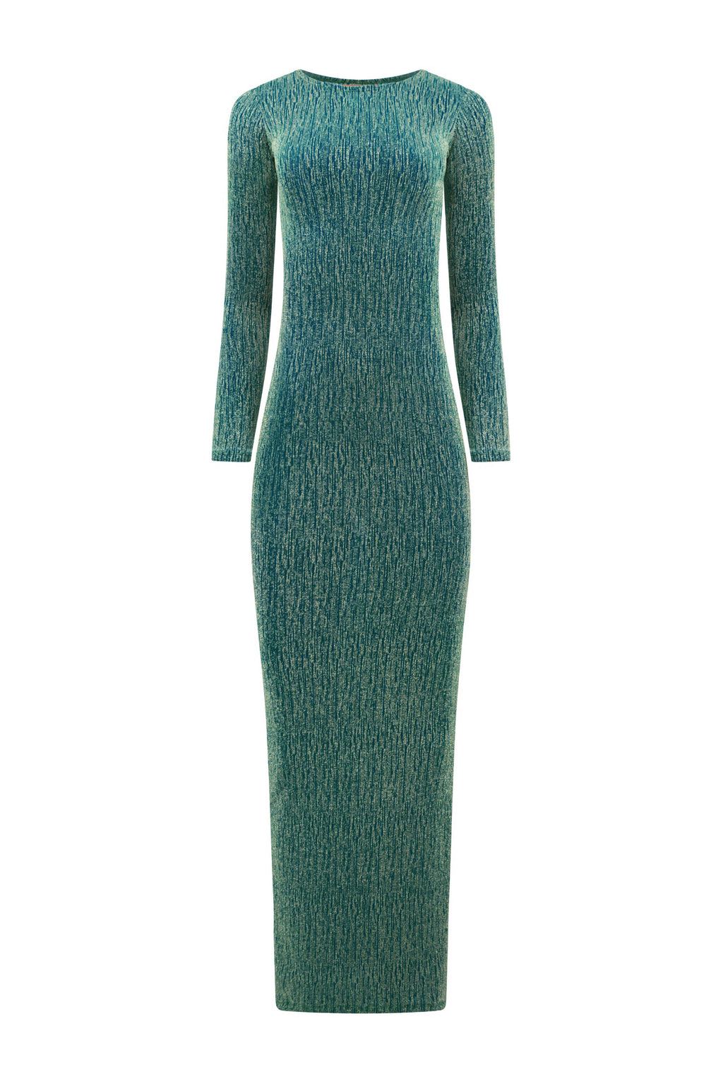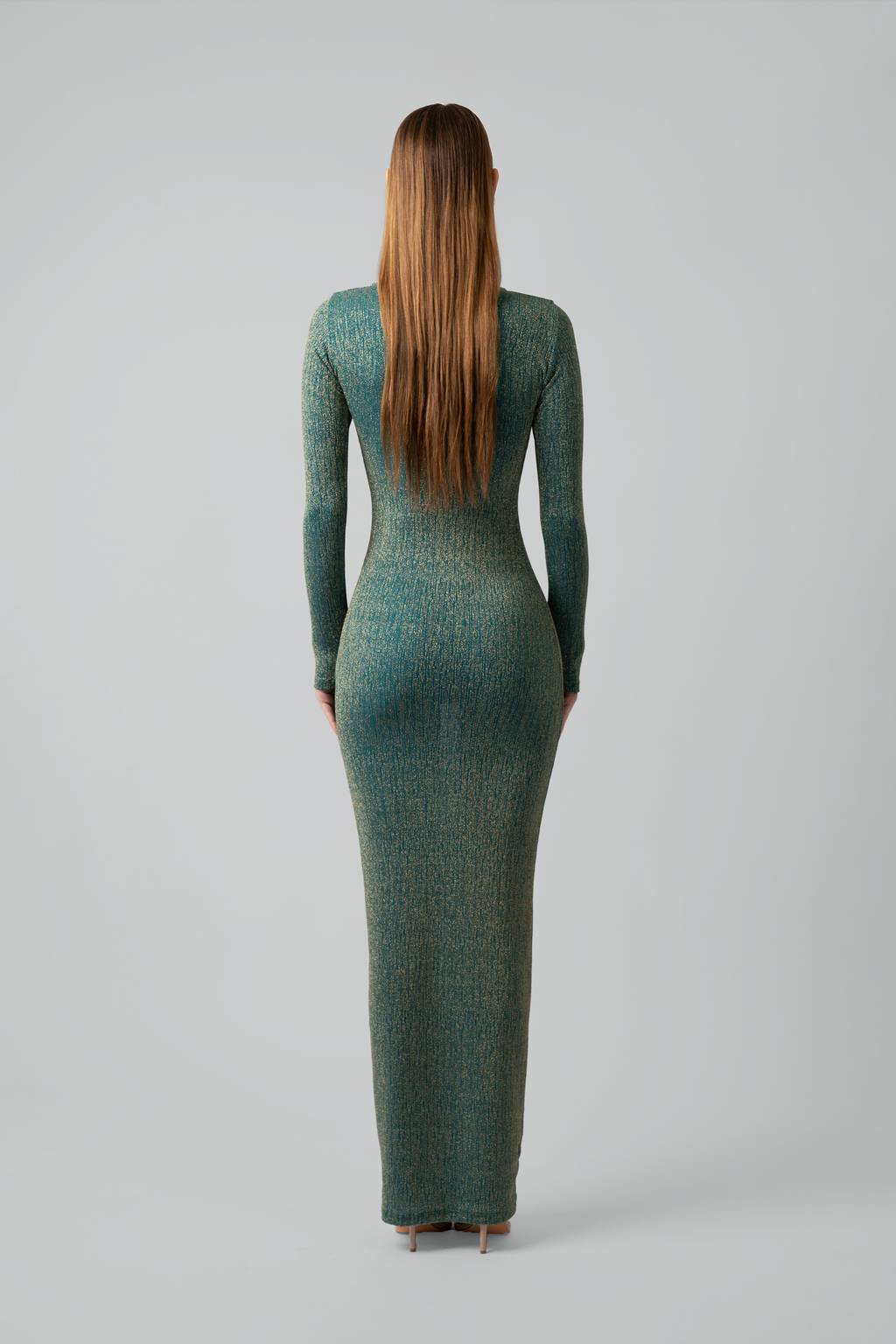 The Monarch Dress seamlessly combines chic style and comfort. Its floor-length silhouette is crafted from striking stretch fabric, featuring a textured shimmer fabric. The unique thumb cut-out sleeves add flair while keeping your wrists warm during colder months.